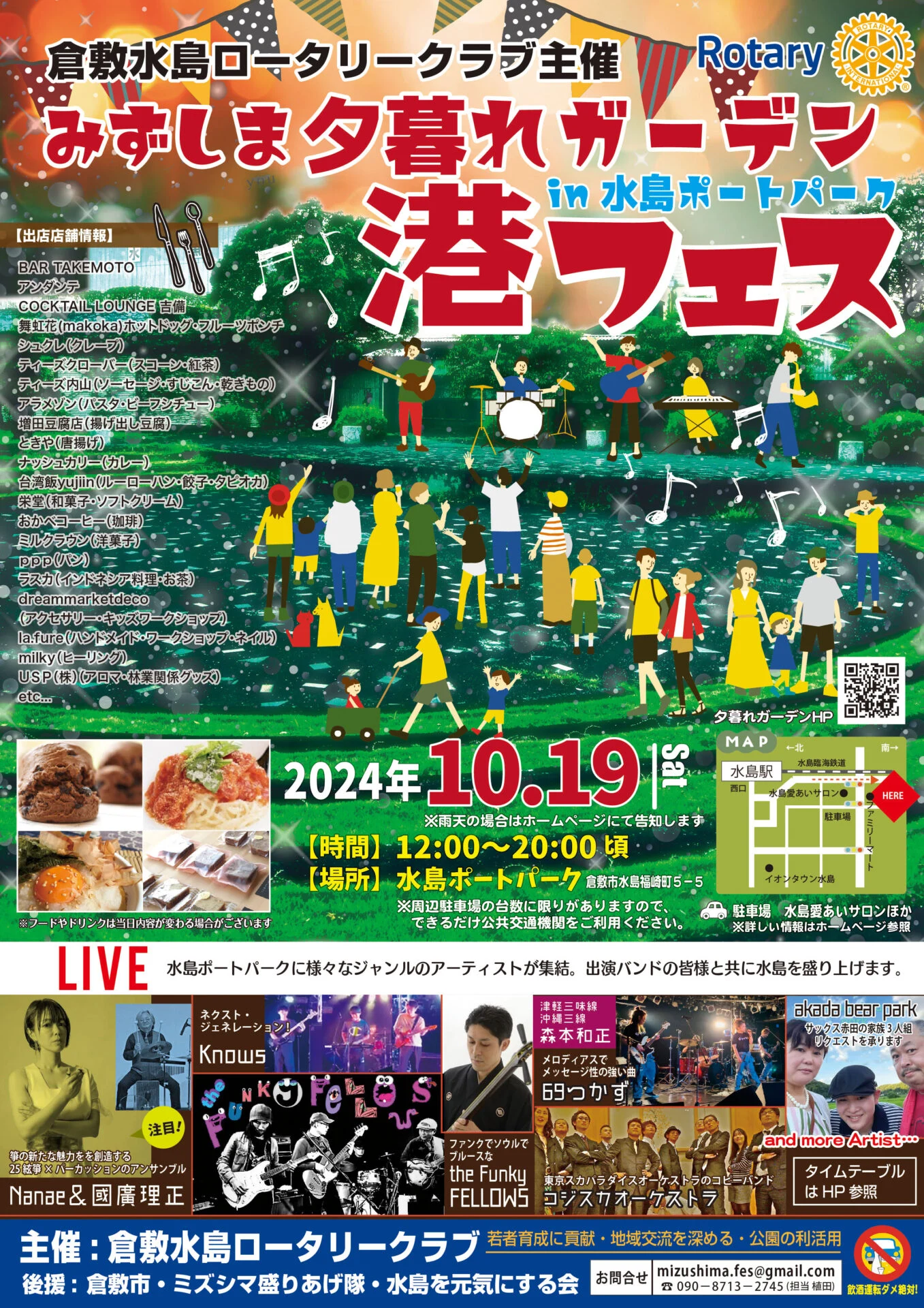 2024年10月19日に開催された「みずしま夕暮れガーデン港フェス」は、水島ポートパーク公園の魅力を地域の人々に再発見してもらうことを目的に企画された音楽イベントです。普段はあまり利用されていない公園を「人が集まり、楽しめる場所にしたい」という想いから立ち上がり、倉敷水島ロータリークラブを中心に、ミズシマ盛り上げ隊や地域団体が協力して実現しました。